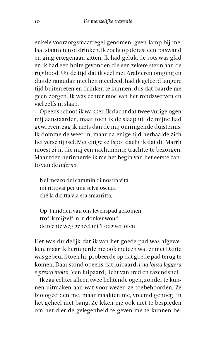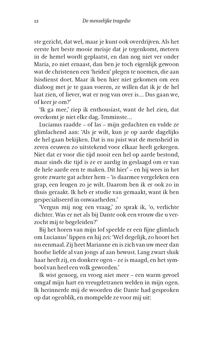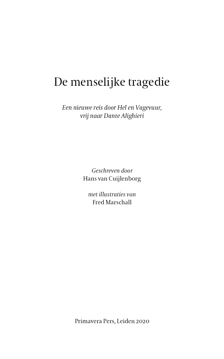 De menselijke tragedie is een nieuwe reis door Hel en Vagevuur, geheel toegespitst op de moderne tijd. Het is een satirisch verhaal waarin elke lezer plezier kan beleven. Maar diegenen die bekend zijn met het werk van Dante zullen de knipogen naar het Italiaanse gedicht kunnen waarderen. De prettig leesbare tekst is bovendien verlucht met illustraties in kleur gemaakt door Fred Marschall.